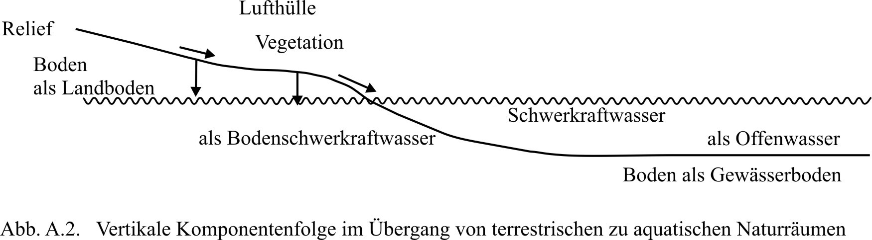 Für die Offengewässer gilt dies alles in ähnlicher Weise. Nur steht hier die mikrochorische Dimension im Vordergrund, und bei der Typisierung ist der Gewässerzustand vorrangig zu erfassende Eigenschaft. Die Naturraumkomponenten sind die gleichen wie bei den Landflächen; nur befindet sich die Komponente Wasser hier über dem Boden, umgekehrt wie bei den Landflächen (Abb. 2).