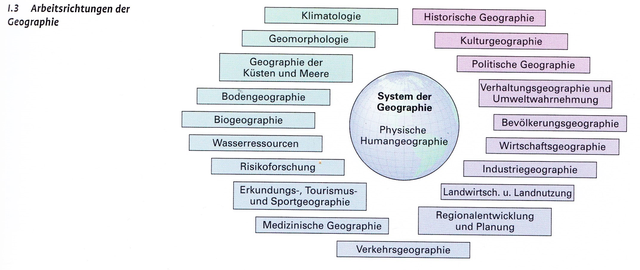 Sie ist ein Teilgebiet der Geographie. Die Geographie ist die Lehr des Aufbaus und des Wandels der Erdoberfläche. Sie untersucht, wie, warum und wo anthropogene und natürliche Prozesse stattfinden und wie diese zusammenhängen. Ein wesentliches Merkmal der Geographie ist der Raumbezug. Der räumliche Bezug bezieht sich dabei auf drei Ebenen: Lokal, Regional, Global